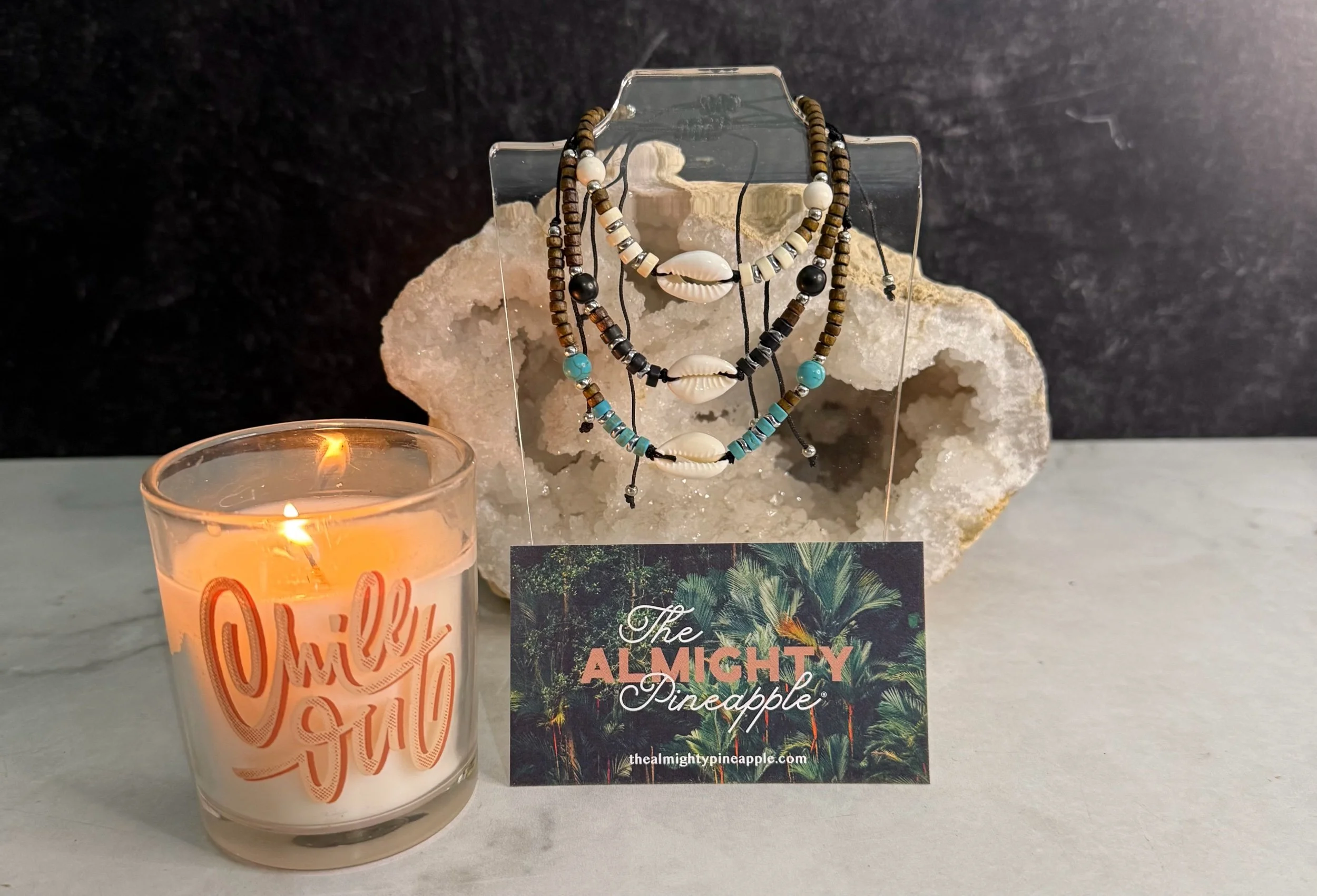 A smiling woman with tattoos, wearing a red headscarf, white lace top, and red pants, sitting cross-legged outdoors with a candle in a gold holder in front of her.
